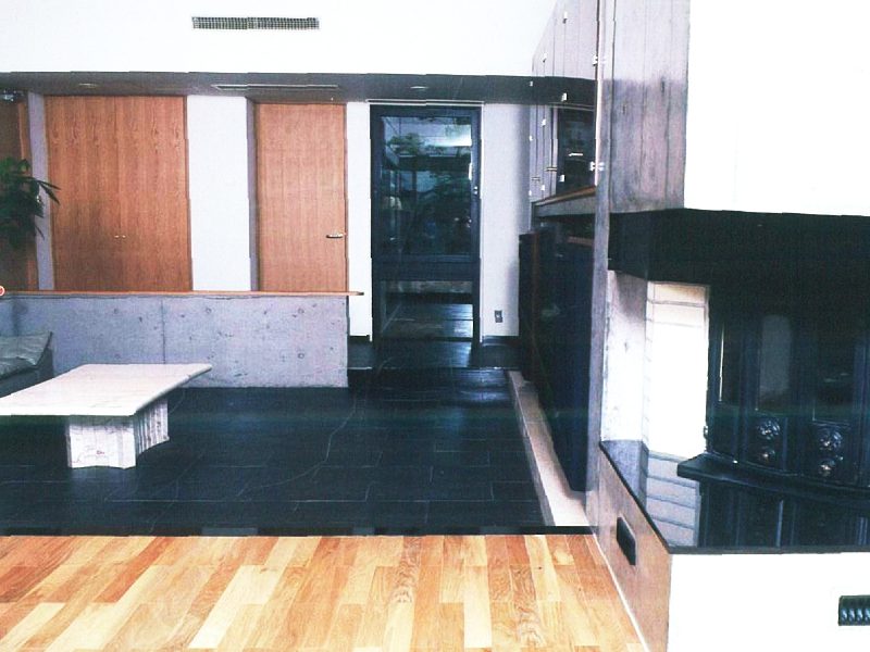 リビングの床は、黒でも表情のある玄昌石を使用しました。白の大理石のテーブルとのバランスも良く、シャープで落ち着きのある仕上がりになりました。(玄昌石部分は床暖房となっています。)
