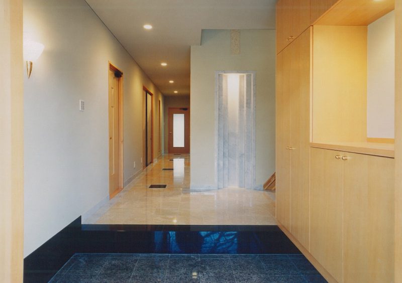 お客様の希望で玄関、廊下とも石張りにしました。多種の石を使いましたが、吟味した石は、美しくまとまったと思います。
