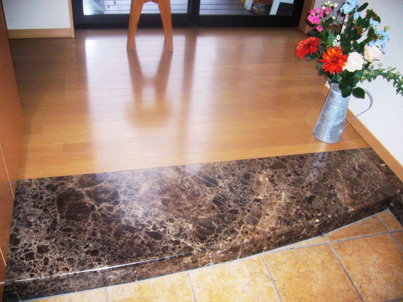 施工事例 TOP 施工事例 式台に石を使用した玄関 式台に石を使用した玄関玄関・ポーチ お客様の要望 式台に石を使用したいが、冷たい雰囲気にならないようにデザインしてほしい。 設計担当者のコメント 内装がナチュラルモダン、メープル色の床だったので、茶系の大理石を選びました。優しい雰囲気になるよう変形のRにデザインしました。1枚板で設計できる寸法を確認して、現場をその寸法に合わせて頂きました。 仕様 式台 マロンインペ・本磨き仕上げ 一覧に戻る