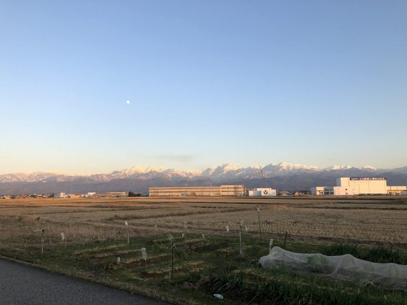 2019.12.10 その他 続、石張り 先月より施工させて頂いておりました、石張り工事も大詰めを迎えております。 他工事との兼ね合いもあり、しばらく中断しておりましたが数日前より再開しました。 今週は天気も良く、絶交の石工事日和でございます。 画像は昨日の夕方、月と立山連峰でございます。