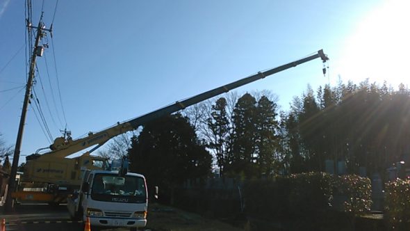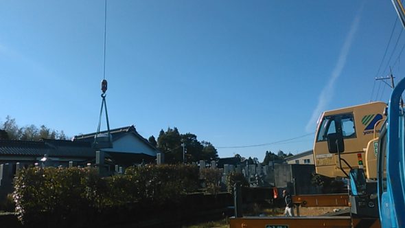 お墓工事というのは造成された霊苑や村墓地など様々なところで行いますが、毎度毎度ユニック車で横付けでひょいと降ろせるとは限りません。そんな場合は広範囲に重量物を吊り降ろす事ができるレッカー車を準備します。
