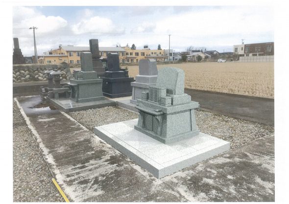 市内某所の霊園にて、お客様よりご要望頂いた墓石を墓地にはめ込んだ画像です。非常に精工に出来ておりますが、画像手前のお墓は当社の設計室が作成した3Ⅾ画像になります。
