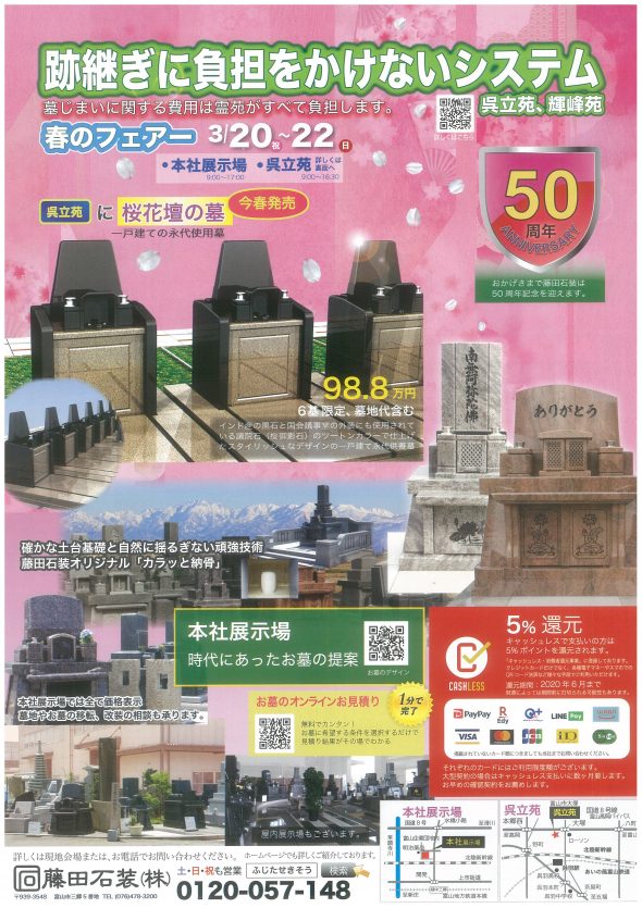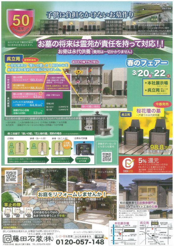お墓アドバイザーブログ TOP お墓アドバイザーブログ 「春フェアー」3月20日(金曜)~3月22日(日曜)の三日間… 2020.03.16 お墓づくり 「春フェアー」3月20日(金曜)~3月22日(日曜)の三日間 昨日の朝刊にて折込チラシを配布させて頂き、お問い合わせも数件頂きまして誠にありがとうございました。 さて、いよいよ今週末より3日間「春のフェアー」を開催致します。再々々告知くらいになりますが多数のご来場、心よりお待ちしております。 ついでの土曜日ラン。。 あまり調子の良いランではありませんでした。 お墓づくりのその他の記事を見る 2023.12.11 本日の現場 2023.12.07 陽光型ミドル