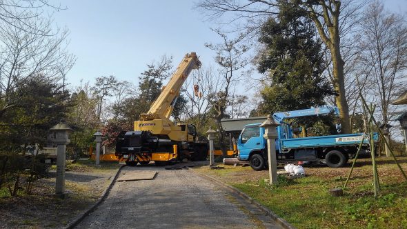 丸柱の重さは約1.8t。。50tラフターでなければ建て込み箇所まで吊り上げる事ができません。
