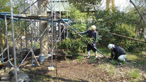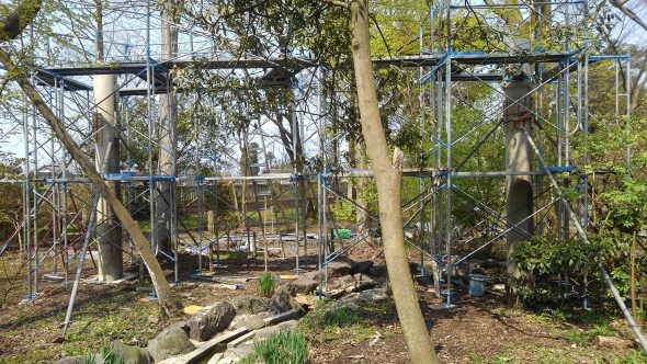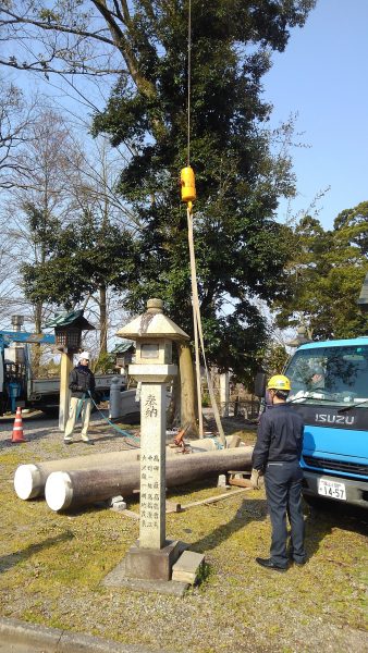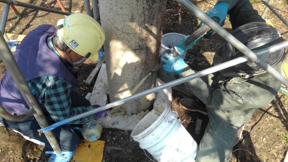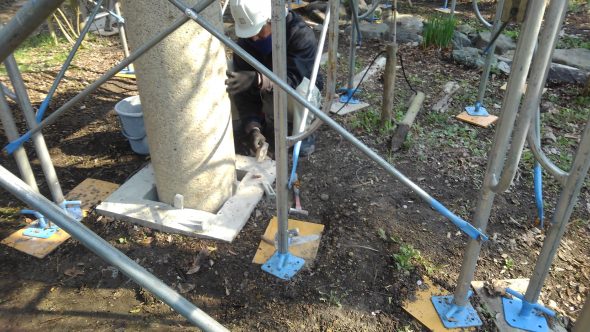 養生期間を数日とらなければならないので、本日の作業はこれにて終了でしたが工事はまだ途中でございます。丸柱の上にとある物を取付予定でございまして、そちらの作業は4月末を予定しております。