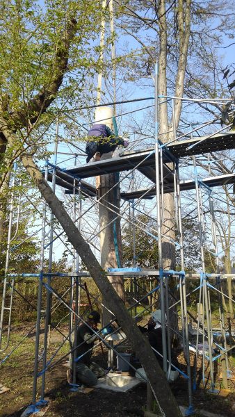 足場はあらかじめ組み上げており、慎重に建て込みます。