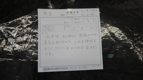 ブログアップ後、即総務さんが事情を防寒着のメーカーさんに問い合わせしてくださり、一度現物を確認させて欲しいとご要望頂いておりました。昨今暖かくなったので防寒具を総務さんに預け、メーカーさんに確認してもらったところ下記のメッセージ付きで戻ってまいりました。