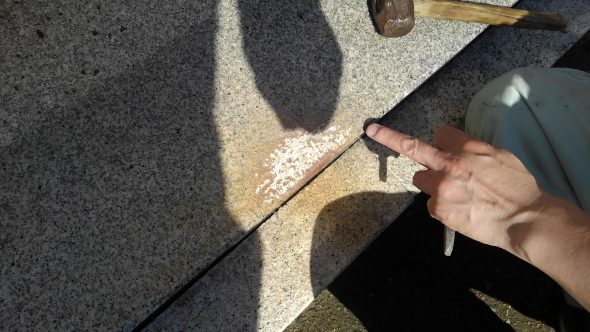 工場のKさんが叩いていたのはコレ、展示場の敷石なのですが経年変色がすすんでおりました。