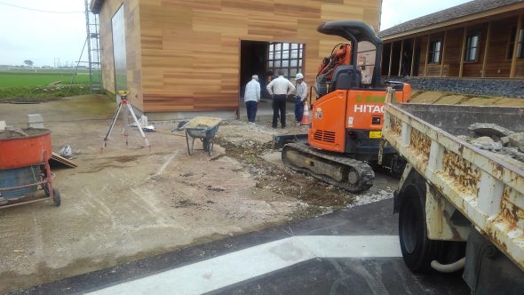 朝から砂・セメント等を搬入し、仕上がりの高さなどを最終確認しました。
