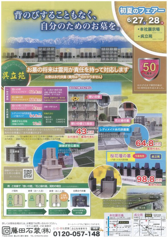墓石工事のご相談、墓地をお探しの方はぜひ藤田石装まで。