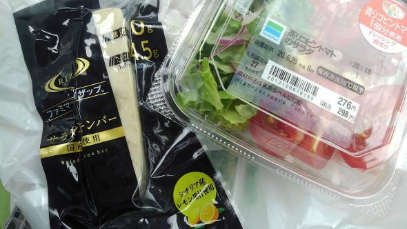 とある日の昼食(ファミリーマート編)です。個人的にサラダチキンはファミマ限定のライザップバーが一番お勧めです。(人気なのかあまり売っていません)