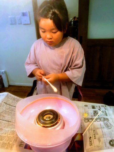 さてこちらは昨日の出来事、思い出したかのように綿菓子したいというので引っ張り出してきました。。