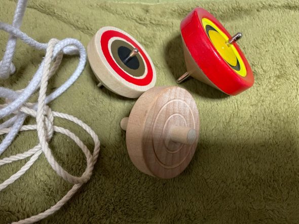 最初に100均で買ったら紐がやたらと短く、上手くいかなかったので玩具店で木ゴマと鉄芯タイプを購入しました。自分はあまり子供の頃にコマ回しをした記憶がなく、娘の方がよっぽど上手です。