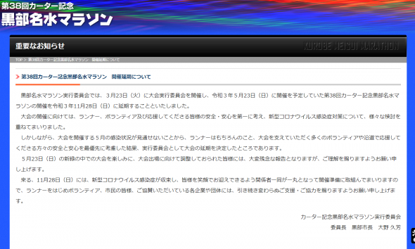 今年の5月23日に予定されていた黒部マラソンが、11月28日に延期されるとの事で確認してみたところホームページに下記画像の様な記載がされておりました。