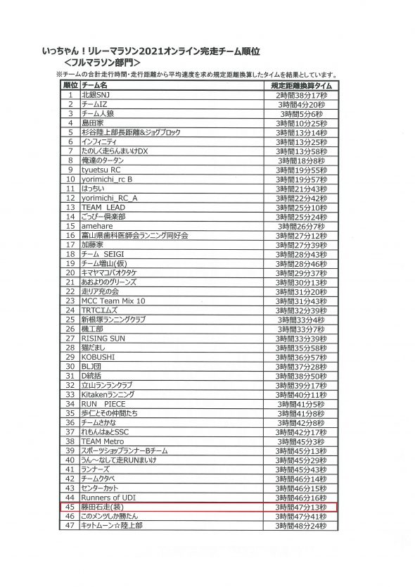 先日、「いっちゃん!リレーマラソン」の結果が発表されまして、チーム藤田石走(装)は45位という結果でございました。