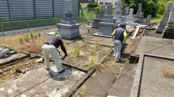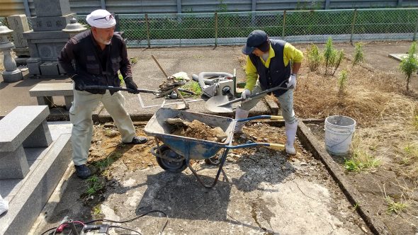 2021.07.13 お墓づくり 着工 お盆前の建立へ向け、今日から着工した建墓現場でございます。 草止めの為、墓地の表面に薄くセメントが塗り固めてあり、そちらの解体撤去の模様です。 お盆まで約一ヶ月、工事が安全に無事完了できるよう頑張ります。 墓石工事のご相談、墓地をお探しの方はぜひ藤田石装まで。 藤田石装お客様相談室 0120-057-148