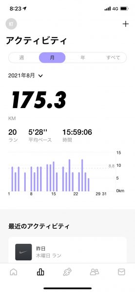 ジョギングの方は今月はなかなか厳しい状況です。20回も走っているのに175キロ。。一回当たりの走行距離が短いという事で今月200キロ達成は問題ないですが、来月は週末ランで距離をのばさねばなりません。