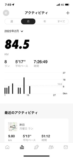 昨日までで84.5㎞。。今月は短いので月200㎞は微妙なところではございますが、室内のランニングも想定して頑張っていこうと思います。