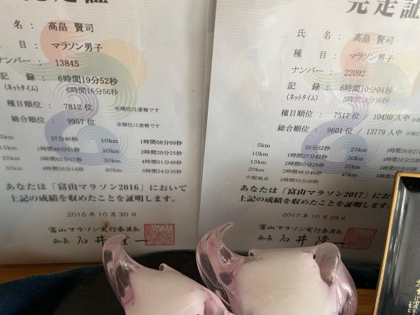 長距離をランニングする際は実家(呉羽の方)から走り出す事が多いのですが、実家の下駄箱の上にある過去の完走証2枚。。