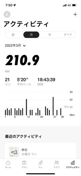 ランニングの方ですが、今月は昨日で210㎞走破しました。見返すと30㎞走った日がなかったので、4月はがんばります。。