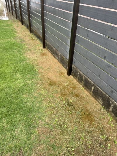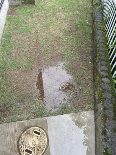 雨の日に見てみたところ、水たまりになっている個所を発見しました。日当たり不良、水はけ不良では育つものも育ちませんね。。目土を少し敷均してみようと思います。