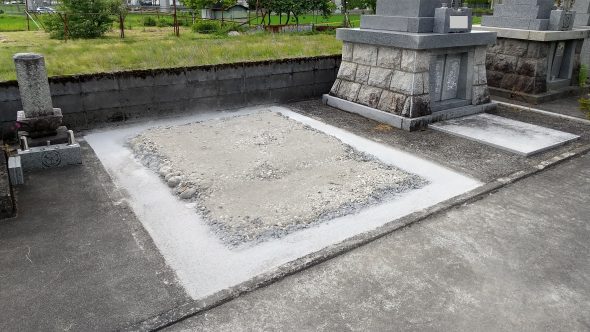 既設基礎の解体も行い、基礎コンクリを打設しました。新規お墓は墓台が既設よりも高くなる設計になっており、この後は外柵の取付が完了してから型枠あてます。