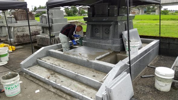 急変する天候にも何とか対応し、お盆前までの建墓に向けて弊社取付班はフル稼働でございます。