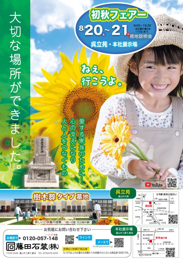 先日からお話させて頂いておりますとおり、お盆明けには「初秋のフェアーお墓ご相談会」を開催致しますので、この間にお墓参りをされた際、何か気になる事がございましたらお気軽にご相談ください。
