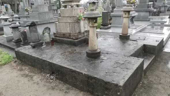 こちらは昭和14年に建てられたお墓でございます。来年に節目の法要のご予定がおありになるとの事で、ひび割れが見られるコンクリの墓台は解体し新規基礎工事を行います。