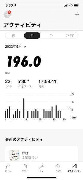 富山マラソンを11月に控えておりますが、今月は何とか今日で200km達成出来そうです。22回走って196kmですので、1回のランキングでの走行距離の短さがわかります。。10月は仕上げの時期、回数を多くこなすより1度の走行距離に重きを置いて取り組みます。