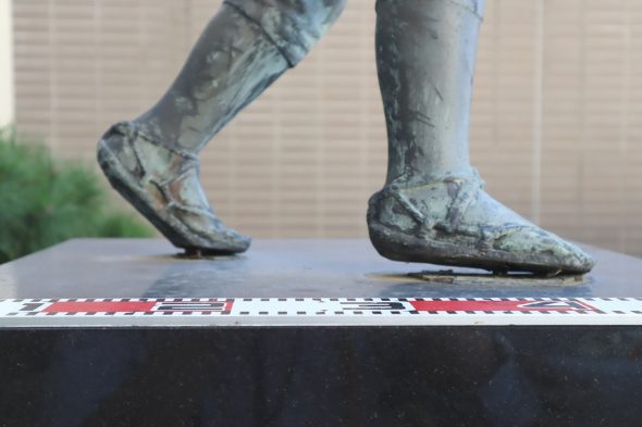 今季3体目の補修依頼がございました。やはり前回までの補修同様に足元にぐらつきがあり、今回の像に関しては本体と土台を繋げている芯棒が確認できます。