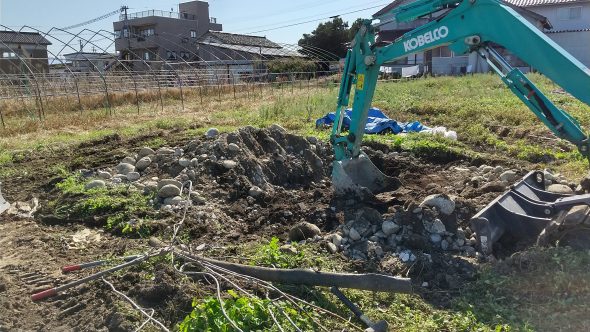 場所の良いところだったので、小型バックホウにて基礎を解体し搬出しました。