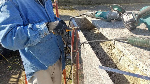 天端の板石を慎重にずらして躯体を確認したところ、中の固定金具が腐食しておりました。