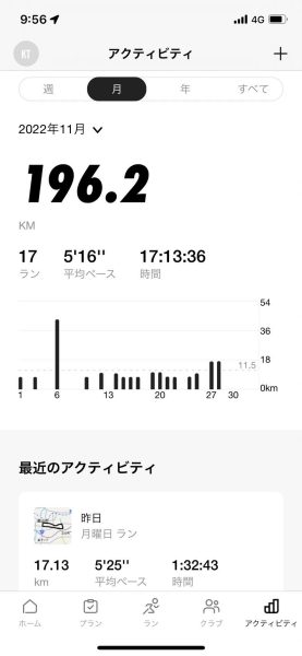 明日で11月も終わります。12月に差し掛かろうかという時期ではございますが今年は今のところ平均気温が高く、寒いと心の底から思う事があまりありません。。ランニングの方はフルマラソンを走った月という事で調整や休足もあり、昨日でようやく196㎞となりました。今日で200㎞達成して明日は休足します。