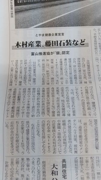 今年の一月にとやま健康企業宣言という事で、ブログを書いておりましたがこの度弊社が「銀」認定されました。次は「金」認定を目指すわけですが、県内で健康企業宣言をしている会社754社中、「金」認定をされた企業は41社とかなりハードルが高そうですが、社員一丸となって目指そうと思います。