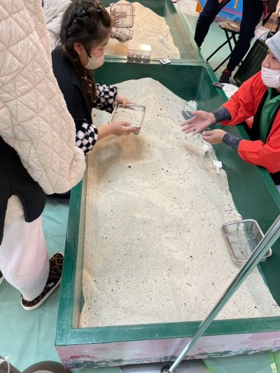 救った砂をふるいにかけ、綺麗な石を探すというトレジャーな企画でございます。中には人口ダイヤモンド約1カラットも入っているという事で、娘が挑戦しましたがダイヤは出ませんでした。。