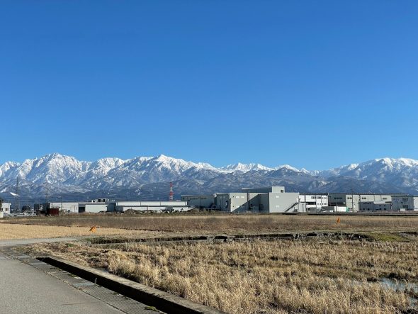 昨日は乾燥した冷たい北風が吹いており、雲一つない快晴だったので雪の立山連峰が綺麗に観えました。堤防沿いや農道に車を停めて、山の景色を撮影している方が大勢おられました。