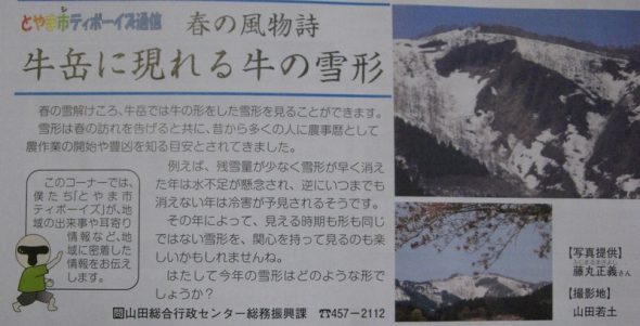 ちなみに「牛岳」の名前の由来は雪解けのころに牛の形をした雪形を見る事が出来る事からという事です。