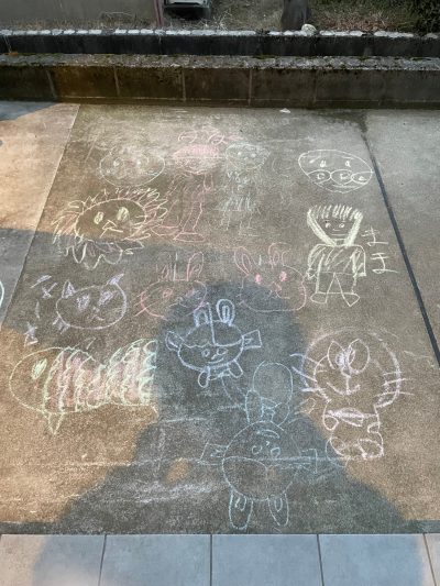 先週末、ランニングから帰ってきたら玄関先にびっしりと書かれておりました。なかなか楽しい絵です。。ドラえもんがお気に入りですが雨が降れば一瞬で消えてしまうので、記録に残しておきました。