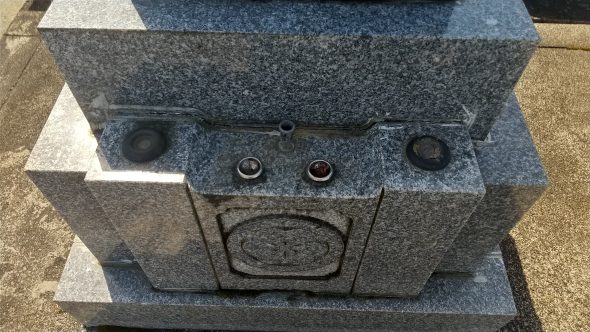 お墓の改修や修繕で花立て、ろうそく線香立ての補修のお問い合わせをしばしば頂きます。下記画像のような納骨室の蓋石に付いている花立てなのですが、一昔前の花立て部分はネジ式になっているものが多く、ネジ部が折れたり噛み合わせが悪くなるなど経年劣化で支障がみられます。