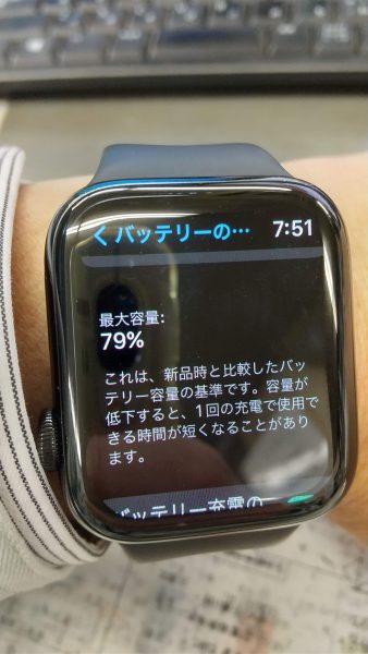 調べてみたところ、アップルウォッチには現状のバッテリーの「最大容量」を確認できる便利な機能がありまして、すぐに確認してみました。現在、自分のアップルウォッチの最大容量は79%、目安は80%との事なので下回っていると色々と支障がある様です。。8800円でバッテリー交換できるという事なのですぐに手配しようと思います。