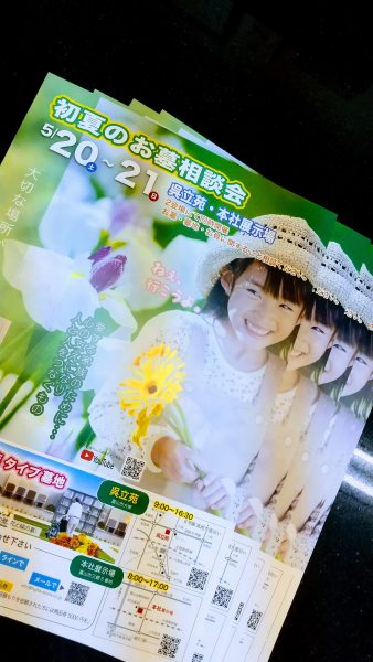 2023.04.26 お墓づくり 5月フェアーのチラシ 5月20日(土曜)、21日(日曜)の二日間「初夏のお墓ご相談会」を開催致します。 詳細は追ってお知らせさせて頂きますが、昨日チラシが届きましたのでご報告させて頂きます。呉立苑の資料ケースの中にも今日から入っております。 墓石工事のご相談、墓じまい、お墓のお引越し、墓地をお探しの方はぜひ藤田石装まで。 藤田石装お客様相談室 0120-057-148