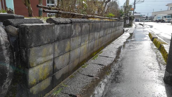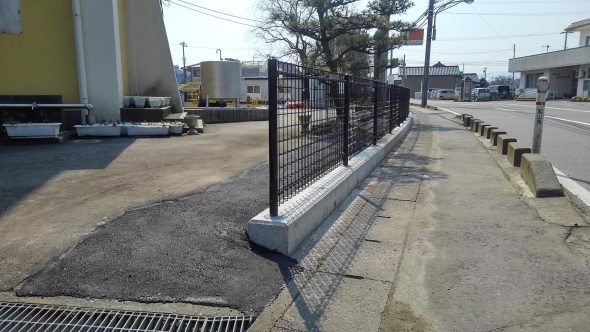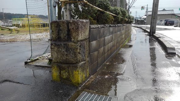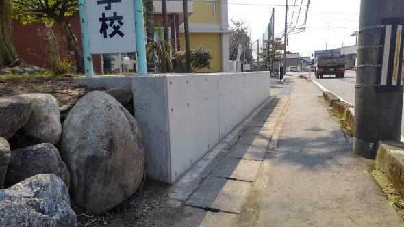 校門付近は門柱及び既設ブロック塀を撤去し、L型擁壁を施工致しました。