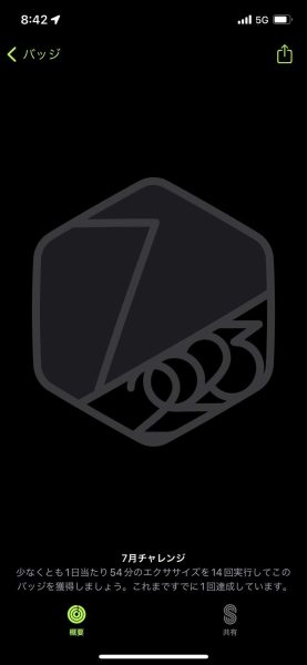 月ごとに様々なミッションが課せられており、今月は54分以上のエクササイズを14回達成すれば下記バッジがもらえます。。