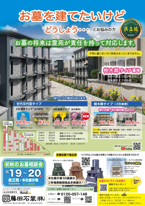 2023.08.17 お墓づくり 2023年お盆明け 本日より通常営業となっております。 お盆中、お墓参りに行かれた際に補修や修理など、お墓関する事で気になる事がございましたらお気軽にご相談くださいませ。 今週末はお墓ご相談会を開催致しますのでご来場お待ちしております。 墓石工事のご相談、墓地をお探しの方はぜひ藤田石装まで。 藤田石装お客様相談室 0120-057-148