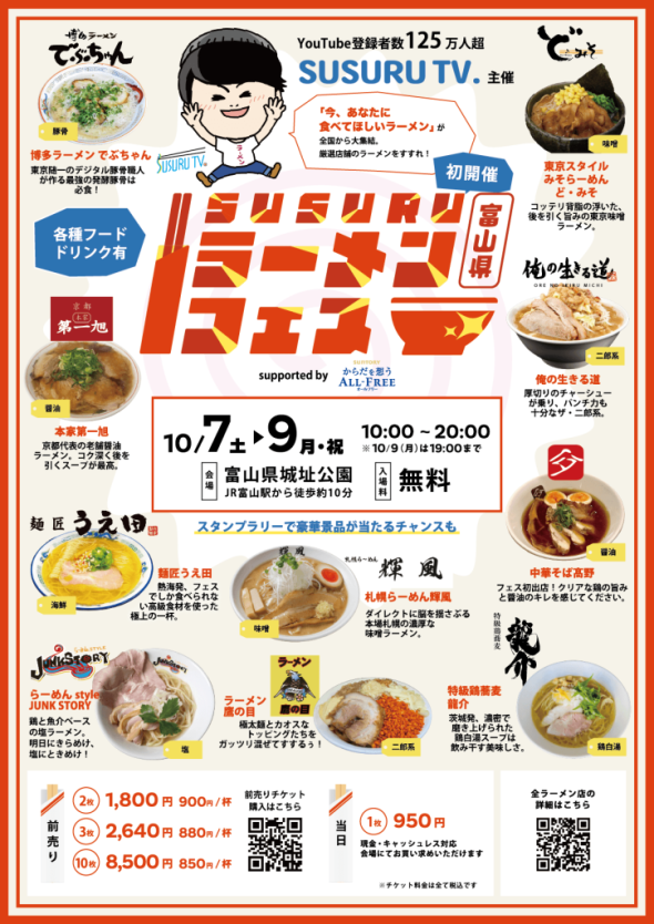 ラーメンユーチューバーのすするさん主催のラーメンフェスが開催されます。自分は見た事が無いのですが、登録者数125万人越えの人気ユーチューバーである同氏が満を持して初主催するイベントであり、全国の名店のラーメンが食べられるまたとない機会です。