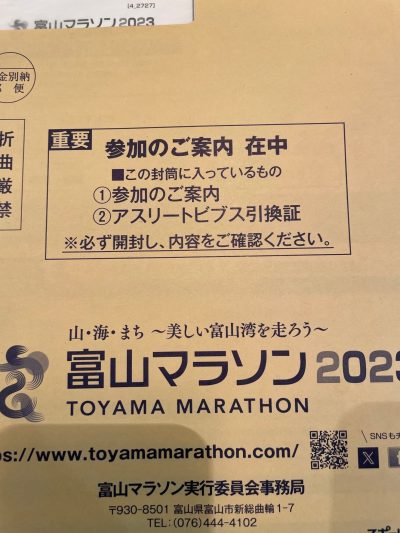 数日前に届いておりました、富山マラソンの封書を開封しました。内容を確認しますと、今年はやはり陰性証明も不要との事で以前の規模くらいで開催されるのだと思います。