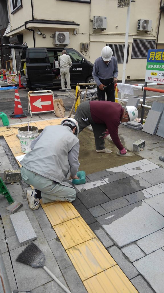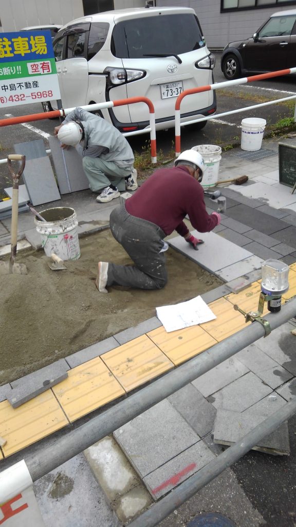 2019.10.21 その他 続・石張り工事 先日ご紹介した富山市の越前町にての石張り工事の続報です。 床の石張り工事の材料にはバサモルタル(通称バサ)を使用します。施工箇所に範囲、高さの墨出しを行い取付けます。 取付は正に職人技でありまして、熟練の技でございます。 同等の施工方法にてお庭の草止め工事を行います。 お庭の雑草にお困りの方がいらっしゃいましたら、お気軽にご相談くださいませ。 営業:高畠