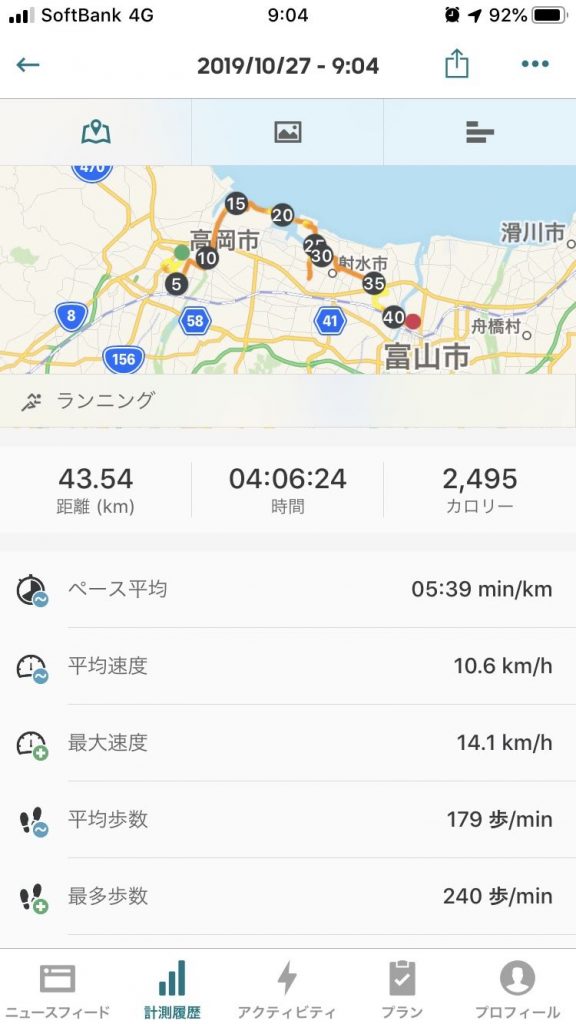 今回の作戦は前半の20㎞くらいまでは混雑していることも鑑み、ややゆっくりペースで、前半貯めた力を後半に生かしペースを落とさないように、あわよくば加速するというものでした。