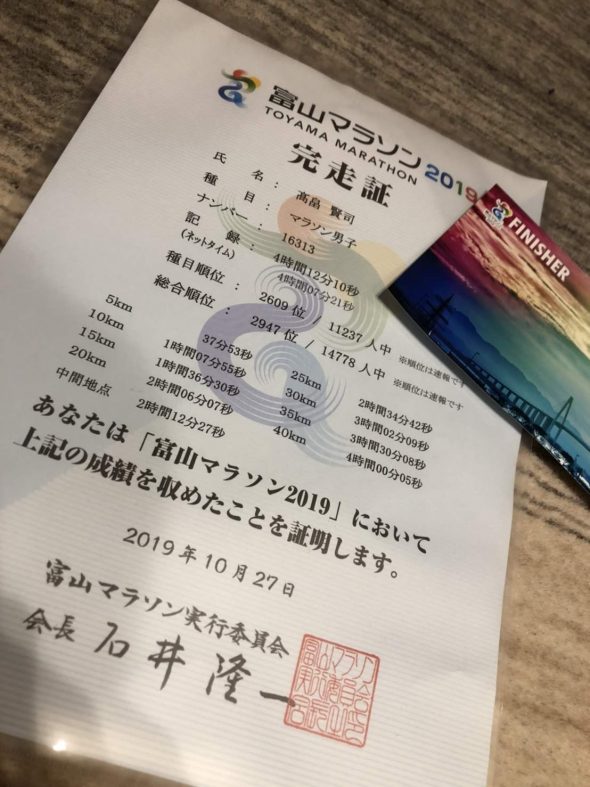 雨で全身びちゃびちゃでございましたが、完走証、メダル、タオルなどをもらい自分の中で100点満点のマラソン大会でございました。